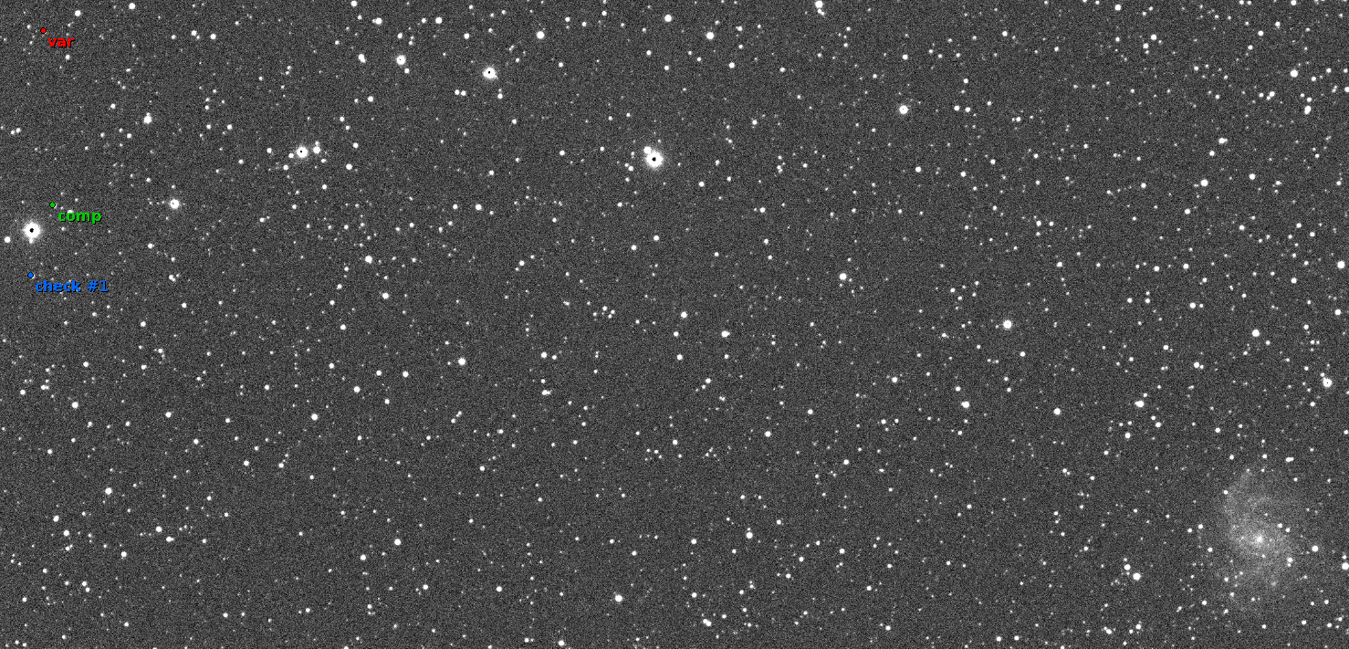 Poznámka:cmp.star: UCAC4 757-058431 b-v=0.61 m=13.11 chk.star: UCAC4 757-058384 b-v=0.49 m=12.27 ----- EBFit result: ----- Tmin = 2459460.46553 Error (1 sigma): +0.00063/-0.00061 (Bootstrapping), +0.00026/-0.00020 (Prayer bead), +0.00038/-0.00038 (LSM) Error (95% CI): +0.00130/-0.00124 (Bootstrapping), +0.00052/-0.00046 (Prayer bead) LSM: chi^2 = 106.9, n_freedom = 48