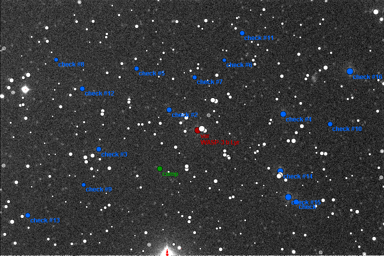 Předběžné zpracování s využitím korekčních snímků. Během pozorování přecházela slabá vysoká oblačnost a částečně rušil Měsíc po 1. čtvrti. expozice 60 s, FWHM kolem 4, teplota -3 °C, DQ = 4, TminHJD = 2456727.57332 +/- 0.00214