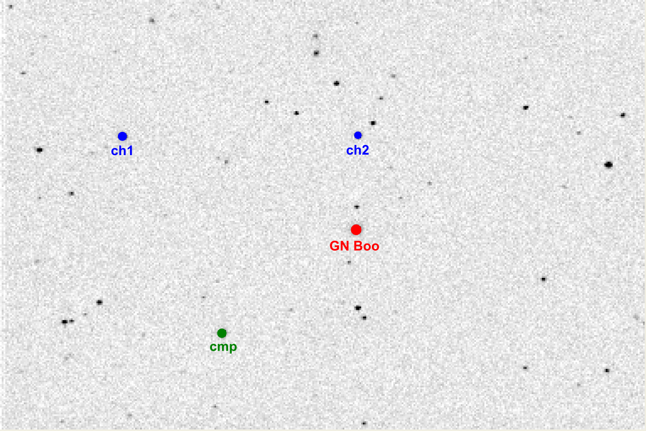 # NAME GN Boo # VAR 14:50:07.77 +29:38:58.5 2452500.0916 0.3016034 10.75-11.35 EW (VSX 20110301) # OBS Martin Lehky (Hradec Kralove CZ; 0.25-m f/4 reflector + CCD ST7) # FLT R # RED CMunipack 1.1.26 + AVE 2.51 # NOTE 01/02 III 2011; R_176_60s (172/106); minimum P # NOTE 2455622.57341 +/- 0.00006; 20110302 01:45:43 (UT) GE # COND nice clear weather