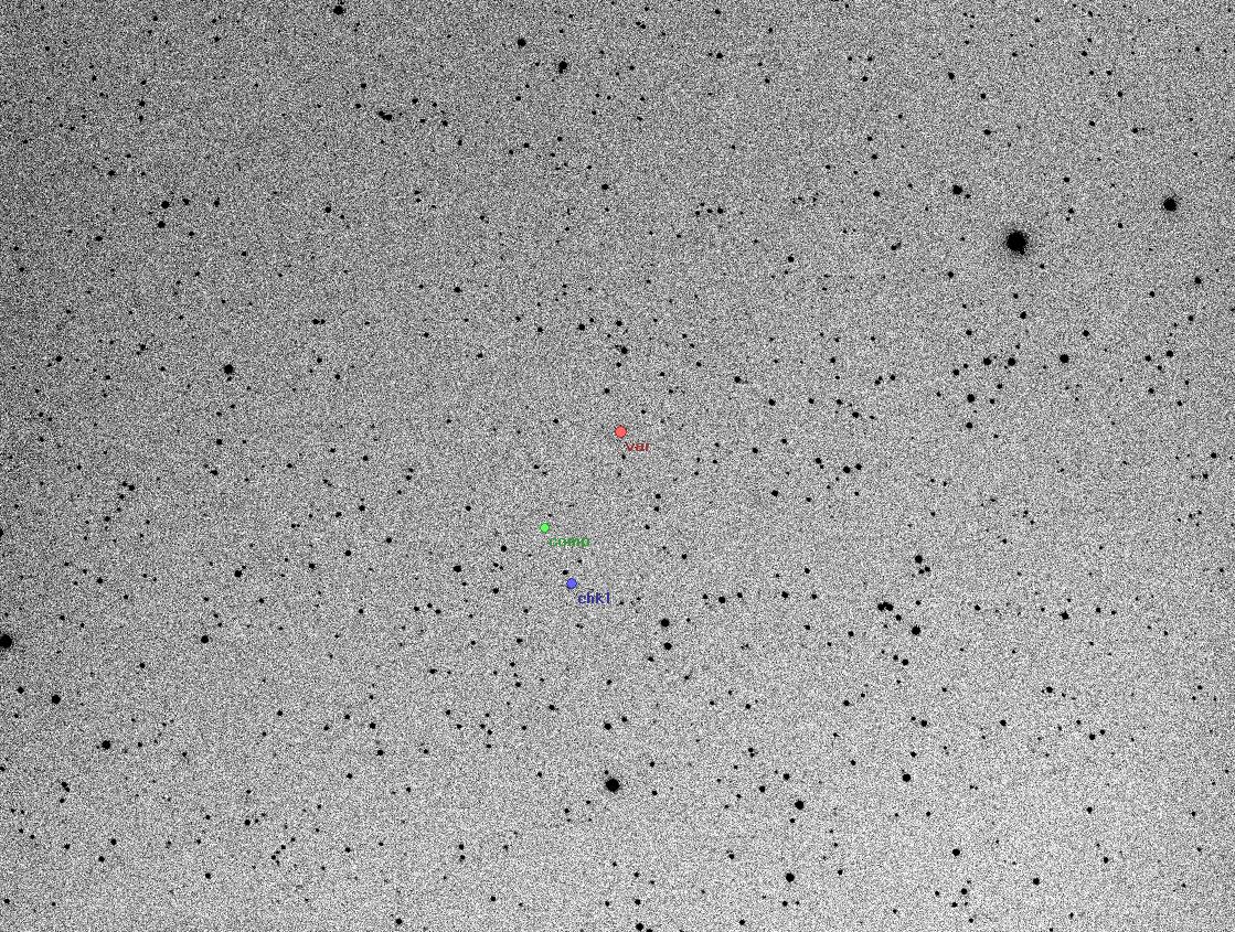 Rovná část bez minima. Nová proměnná hvězda 11,1 - 11,7 mag. Vypadá to na typ Algol. V SIMBAD ani v AAVSO není uvedena. Dalekohled: ED 120/900, CCD: G2-8300, binning 3x3, filtr Visible, expozice 120s, chlazeno na -20°C, mimoosá pointace přes G1, místo: HaP Plzeň, pozorovací podmínky: přesvětlená obloha, na město průměr.