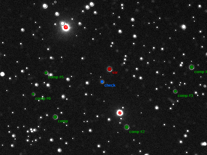 Pěkná obloha, bohužel jsem musel překládat montáž a zasáhlo to do vzestupné křivky, na konci se mi zasekl AG, expozice 150 s, FWHM kolem 7, průměrná křivka z individuálně detrendovaných křivek s 6 porovnávacími hvězdami s různými aperturami,DQ 3, TminHJD = 2455800.49602 +/- 0.00254