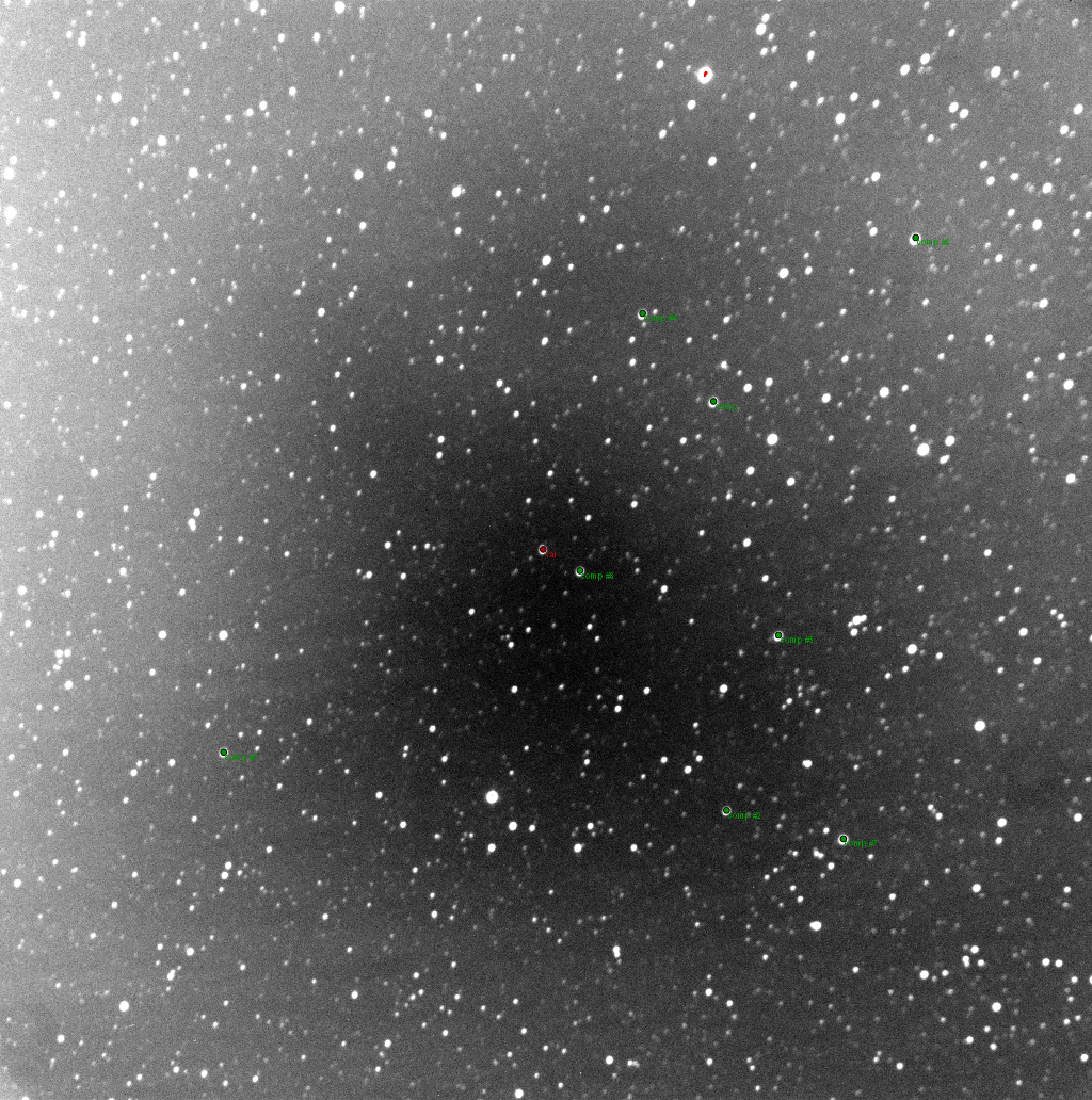 Poznámka:120 sec exposure binning 1x1 filter LNIR defocused and multi star comparison - high clouds + half moon