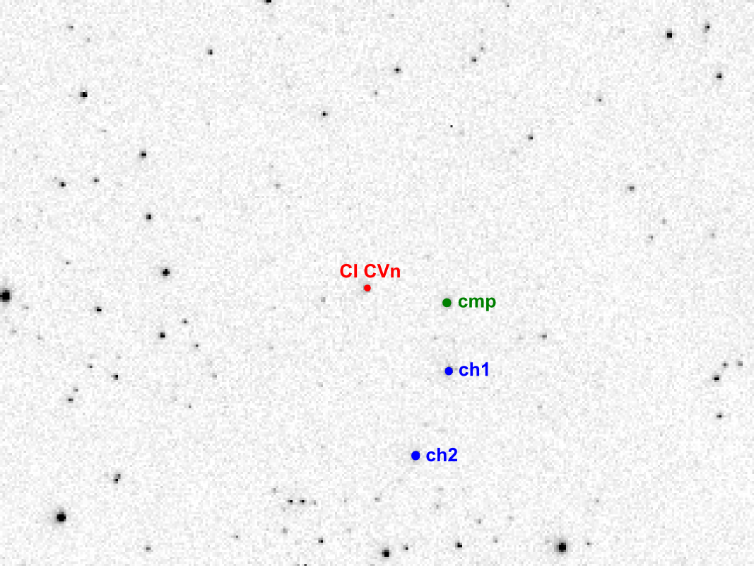 Note:# NAME CI CVn # VAR 13:13:33.32 +47:47:52.6 2448500.508 0.815877 9.357-9.868 (O-C gateway 20090420) # OBS Martin Lehky (Hradec Kralove CZ; EQ6 + 2.8/80 Zeiss Biometar lens + CCD ST5C) # FLT R # RED CMunipack 1.1.26 + AVE 2.51 # NOTE 19/20 IV 2009; R_269_60s (236/122); minimum S # NOTE 2454941.44145 +/- 0.00100; 20090419 22:35:41 (UT) GEO # COND fine clear weather