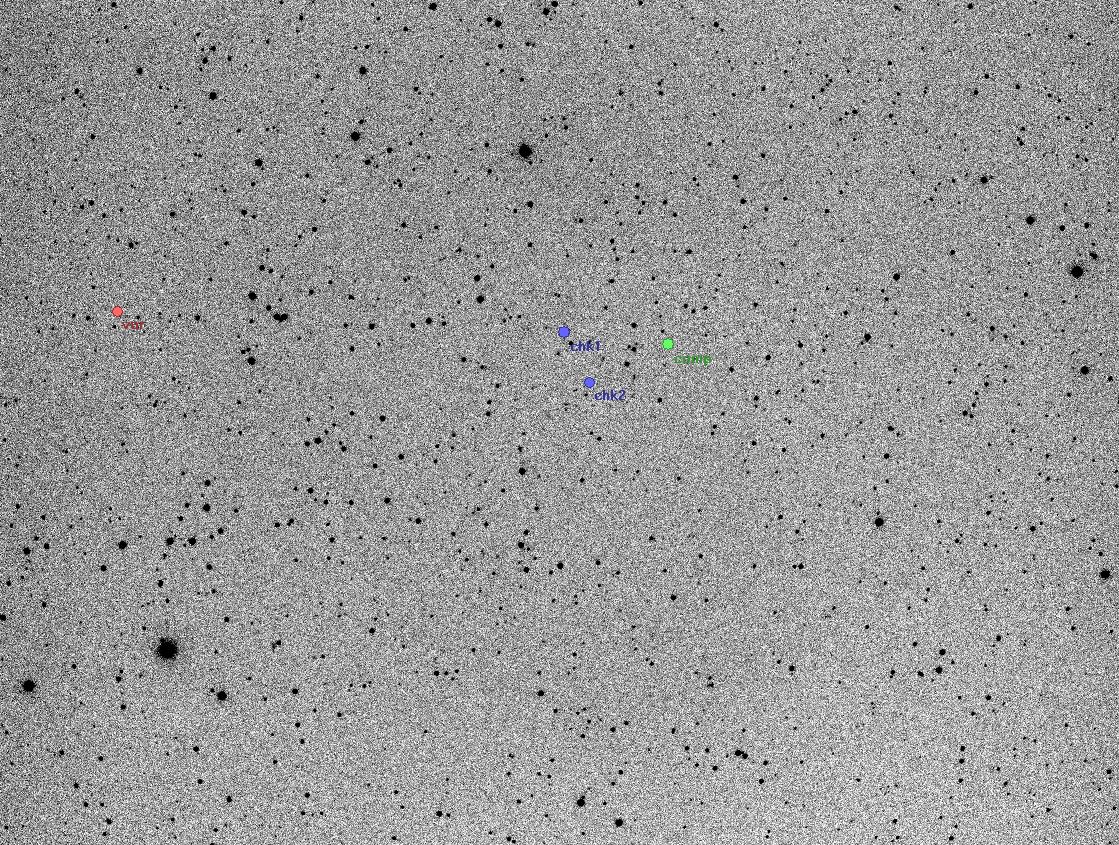 Nezávislý objev proměnné hvězdy: SIMBAD: TYC 4638-455-1 (star suspected of Variability) AAVSO: Name: VSX J153530.2+853739 Coords: 15 35 30.24 +85 37 39.0, Type: DSCT (Delta Scuti), Period:0.09661133, Magnitude: 12.15 - 12.53 R1 Dalekohled: ED 120/900, CCD: G2-8300, binning 3x3, filtr RED, expozice 120s, chlazeno na -30°C, mimoosá pointace přes G1, místo: HaP Plzeň, pozorovací podmínky: přesvětlená obloha, světelný kužel z reflektoru přejížděl pole.