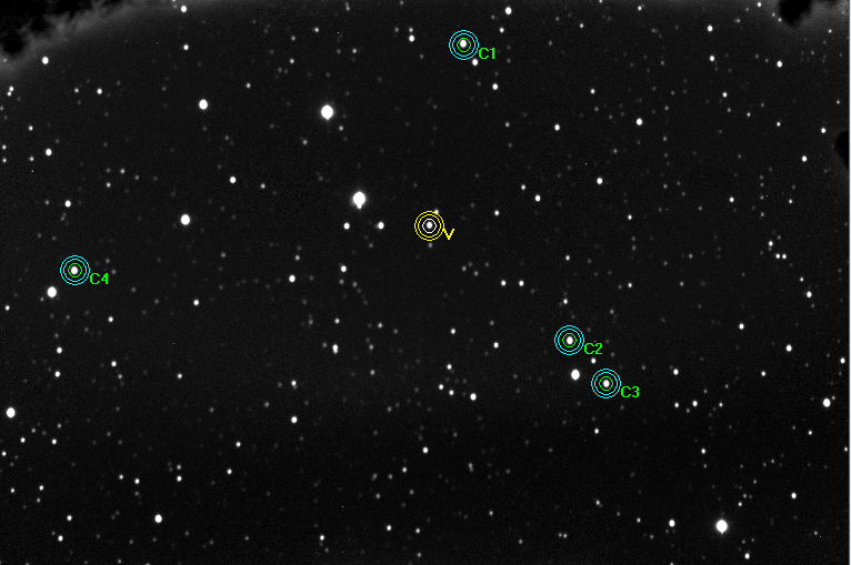 Note:120 sec exposures, thin clouds, the half moon near the target, four comparison stars