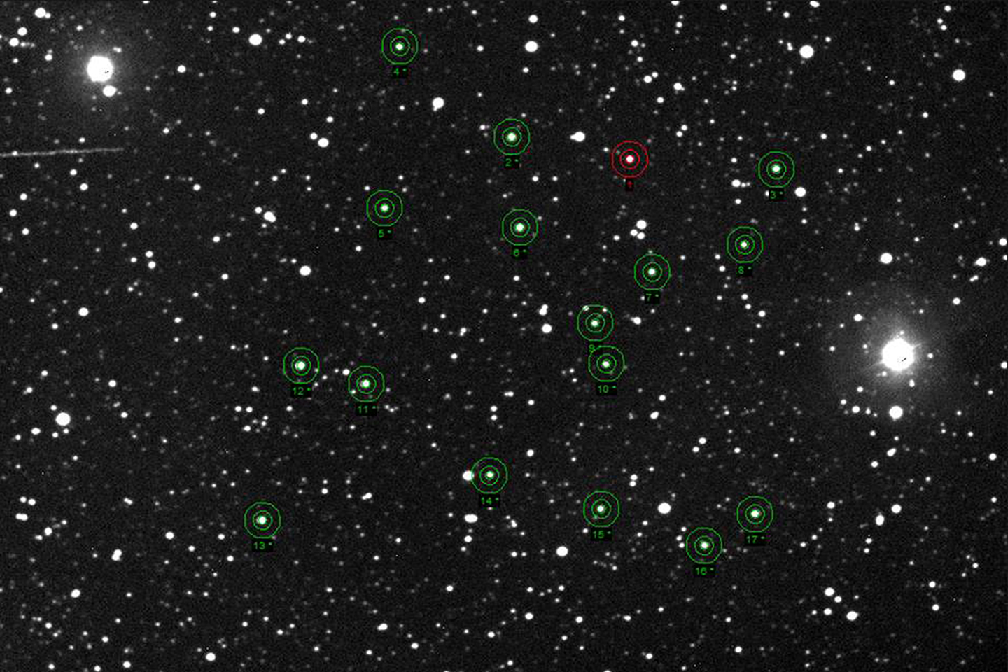 Note:120 sec. Harsh weather, windy, northern lights. Target low in north. Several comparison stars.