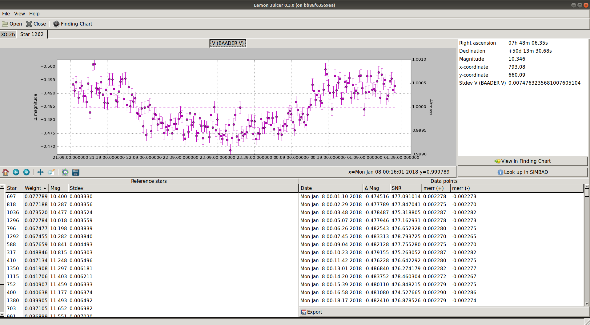 Note:60 sec exposures, BAADER V, reduced with Lemon differential photometry pipeline