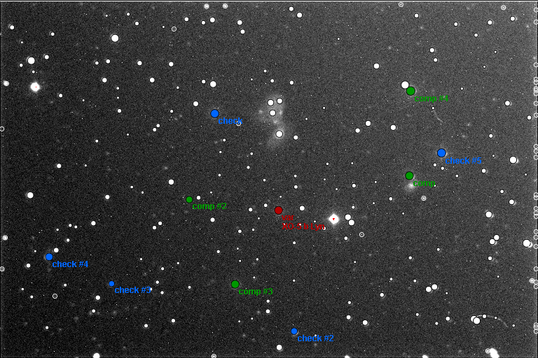 Předběžné zpracování bez korekčních snímků - nutno přepracovat! Jasná obloha, ke konci začalo pole klesat nízko k obzoru, FWHM kolem 4-5, expozice 150 s, teplota -3 °C, místy závany větru. DQ = 3, TminHJD =2456713.56177 +/- 0.00180