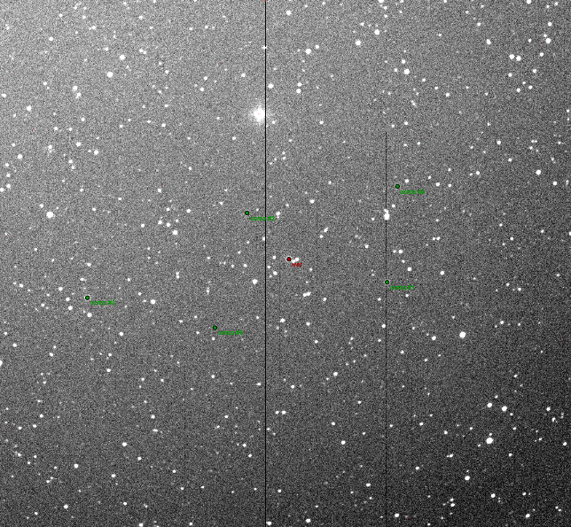 Note:B filter. 120 sec exposures. No moon. Slight defocus. Multicomparison stars. Target on dead column of pixels explains the gap in the data.