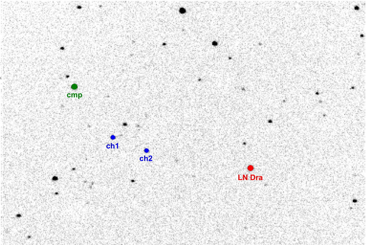 注釈:# NAME LN Dra # VAR 17:45:55.40 +52:38:05.0 2451306.863 0.61215 12.0-12.6 (BRNO O-C gateway 20080225) # OBS Martin Lehky (Hradec Kralove CZ; 0.40-m f/5 reflector + CCD ST7) # FLT R # RED CMunipack 1.1.18 + AVE 2.51 # NOTE 24/25 II 2008; R_290_60s (278/73); minimum S # NOTE 2454521.52175 +/- 0.00016; 20080225 00:31:19 (UT) GEO # COND fine clear weather
