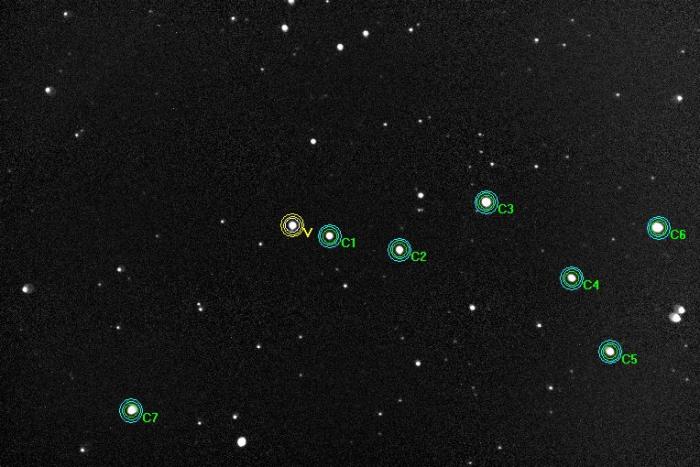 注釈:601 unfiltered images, 30 sec exposures, seven comparison stars used, almost full moon