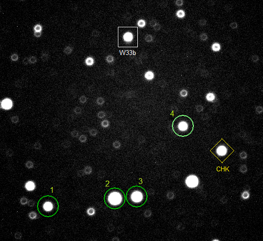 注釈:Used 4 comparison stars. Red magnitude of comparison stars by USNO-A2.0 Catalog. Comp1= 8.1R Comp2=7.8R Comp3=8.1R Comp4= 8.0R. See attached image of field